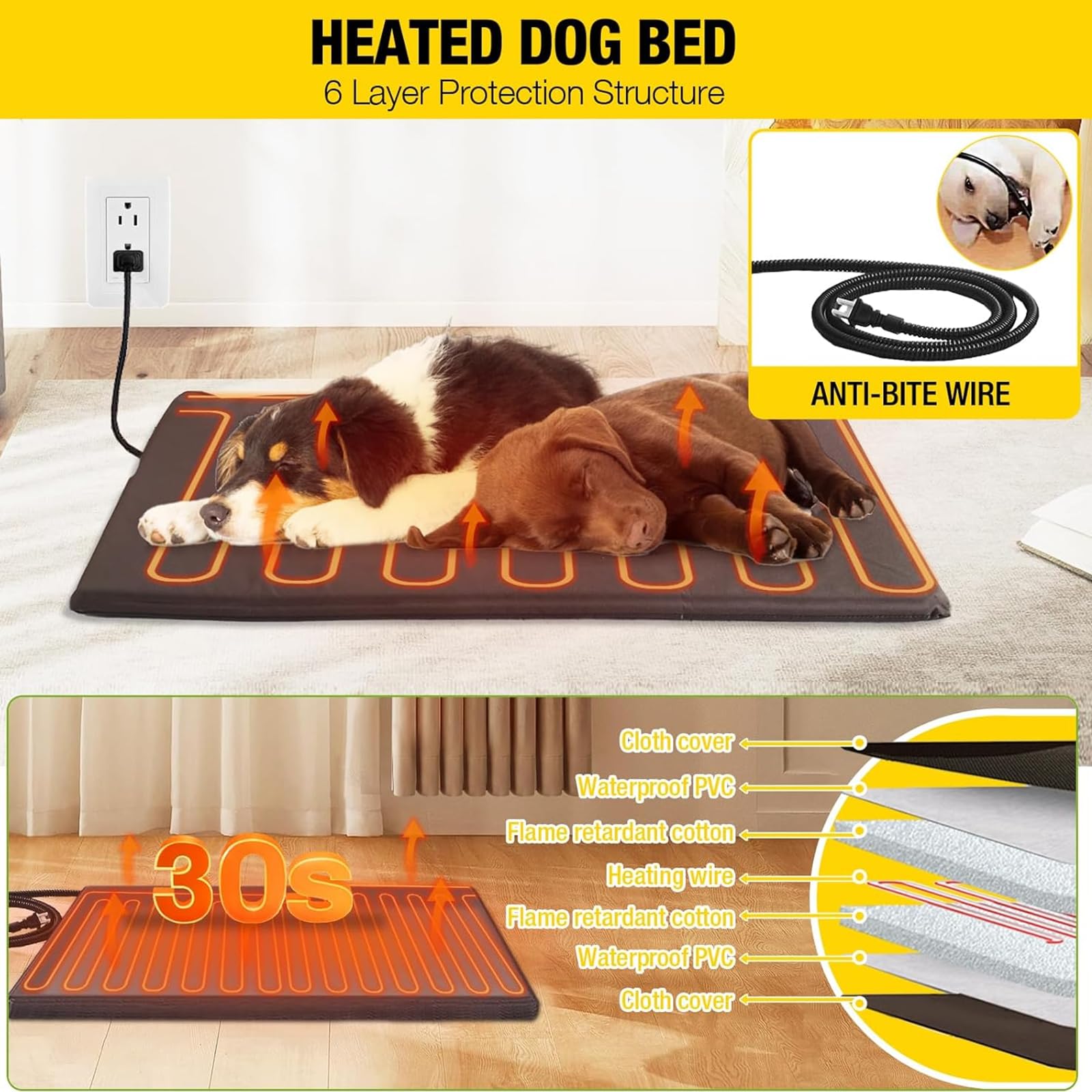 This premium dog house combines comfort and durability for outdoor living. The built-in electric heating pad with multi-layer protection keeps your pet warm through cold weather, while weatherproof construction and insulation shield against the elements. A reinforced metal frame provides superior stability and chew resistance compared to standard wooden designs. At 35.4"D x 59.1"W x 35.4"H, it accommodates dogs of various sizes. Constructed from sturdy fir wood with metal reinforcements, this shelter is built to withstand years of outdoor use.