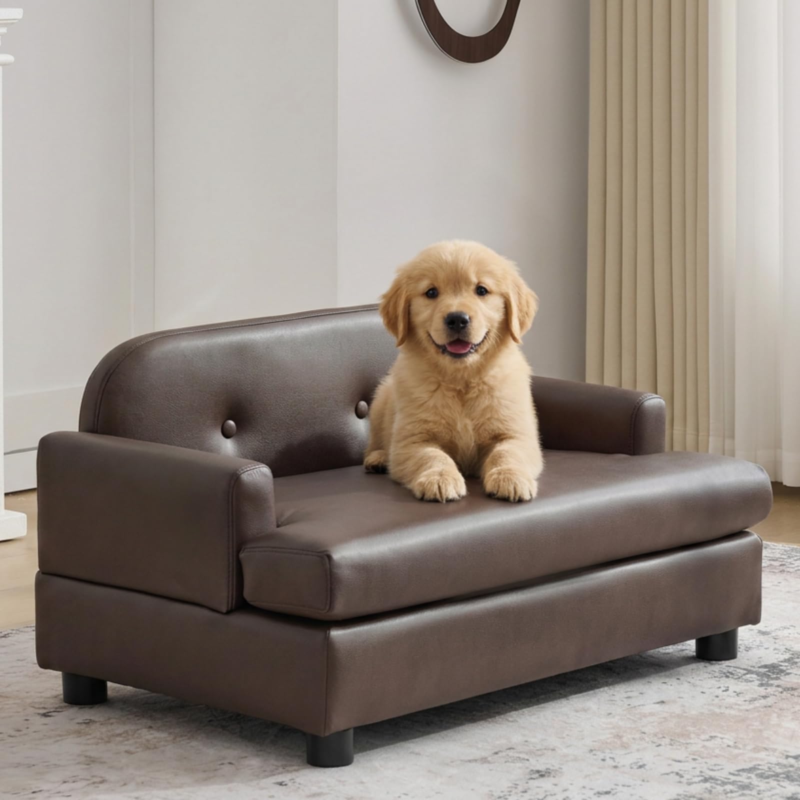 This elevated dog sofa bed combines stylish design with practical comfort for your pet. Built with a sturdy solid wood frame and raised legs, it features a high-density foam cushion with supportive bolsters for orthopedic support. The waterproof leather upholstery resists scratches and spills, wiping clean easily. At 9.8 inches high, the raised design keeps pets off cold floors while improving airflow. It also serves as a helpful step for senior dogs or short-legged breeds accessing furniture. Perfect for small dogs and cats seeking a cozy, durable bed that complements your home décor. Measure your pet's sleeping length before purchasing for the ideal fit.