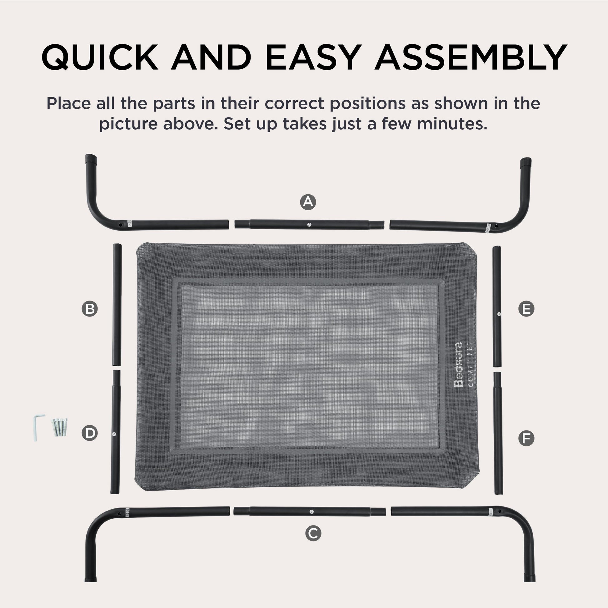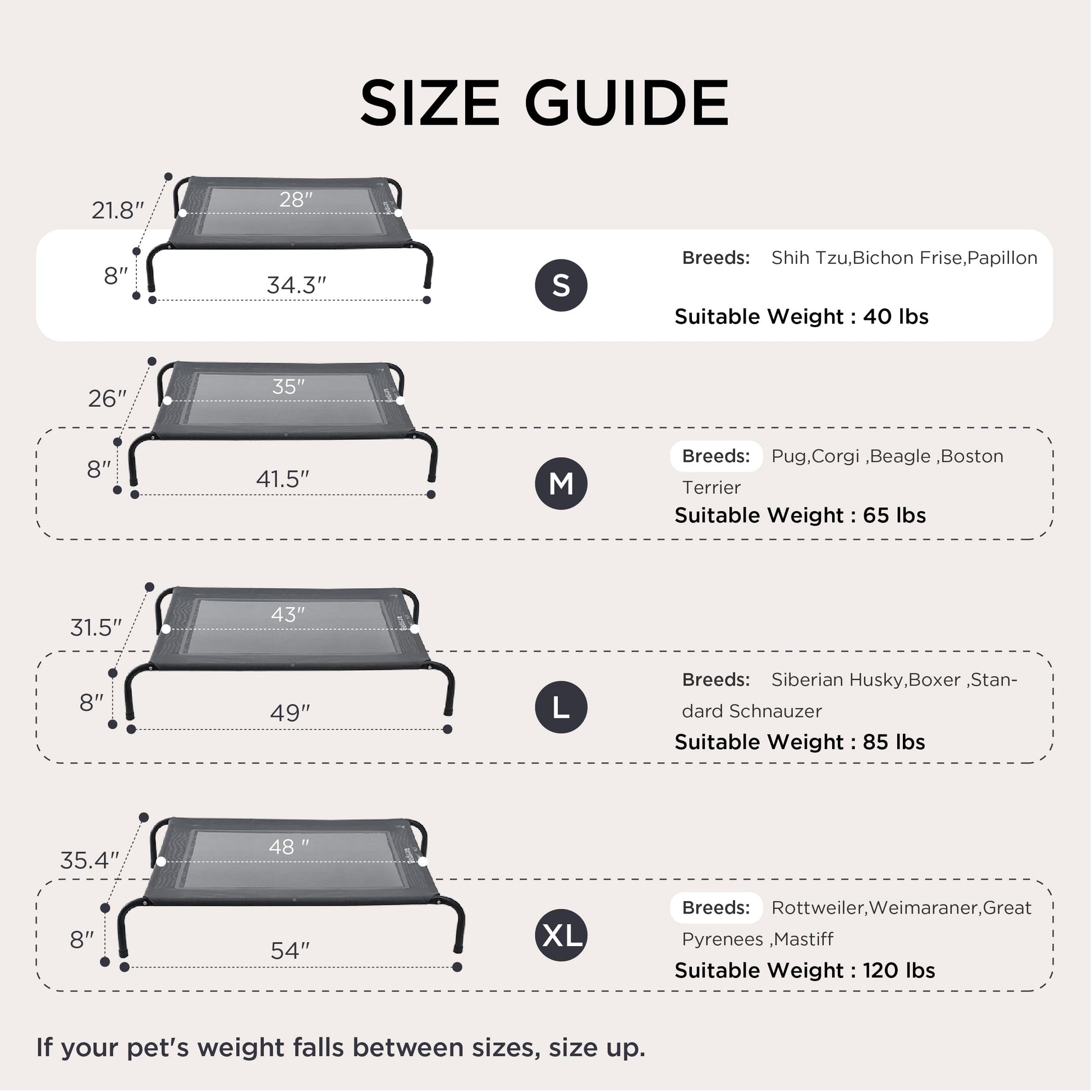 Keep your dog cool and comfortable with this elevated mesh bed designed for year-round use. The 8-inch raised frame increases airflow to prevent overheating, while durable Teslin mesh withstands scratching and chewing. Perfect for indoor or outdoor spaces, it supports dogs from 40-150 lbs and suits all ages. The no-slip feet keep the bed stable on any surface. Quick to assemble, lightweight for travel, and simple to clean with just water or a hose. Available in S-XL sizes.