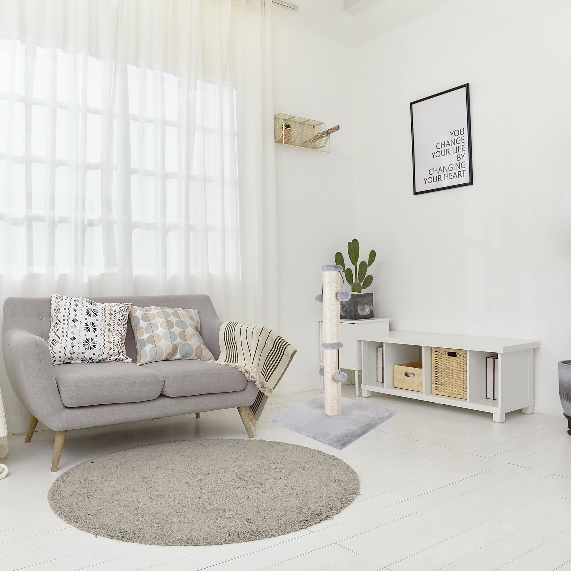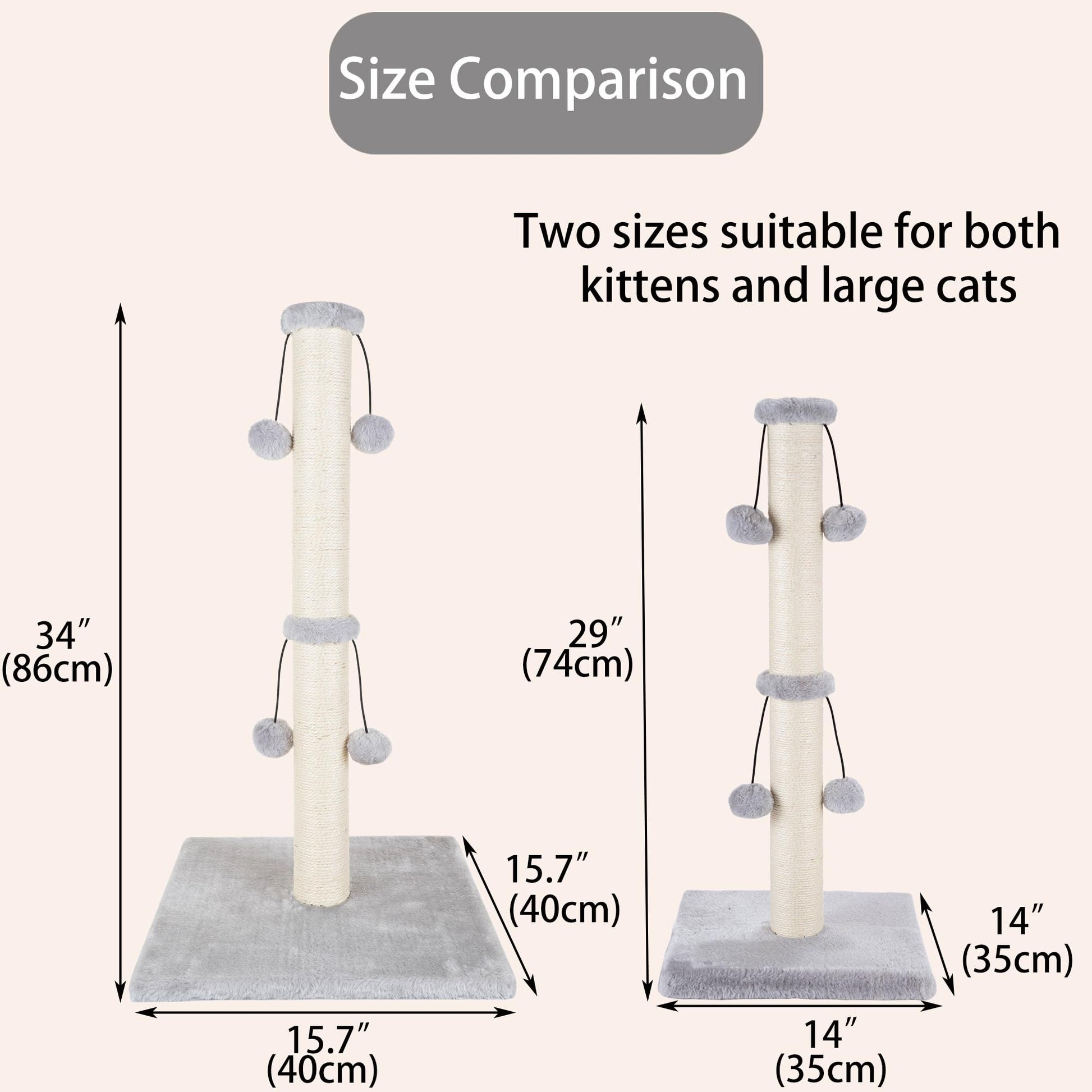 This 29-inch scratching post is designed for cats of all sizes, featuring a natural sisal-wrapped cardboard tube that satisfies scratching instincts while protecting your furniture. The sturdy plush-covered base prevents tipping, and an attached teasing ball keeps cats engaged and entertained. Built to last with quality materials, it assembles in minutes with included tools—no complicated setup required.
