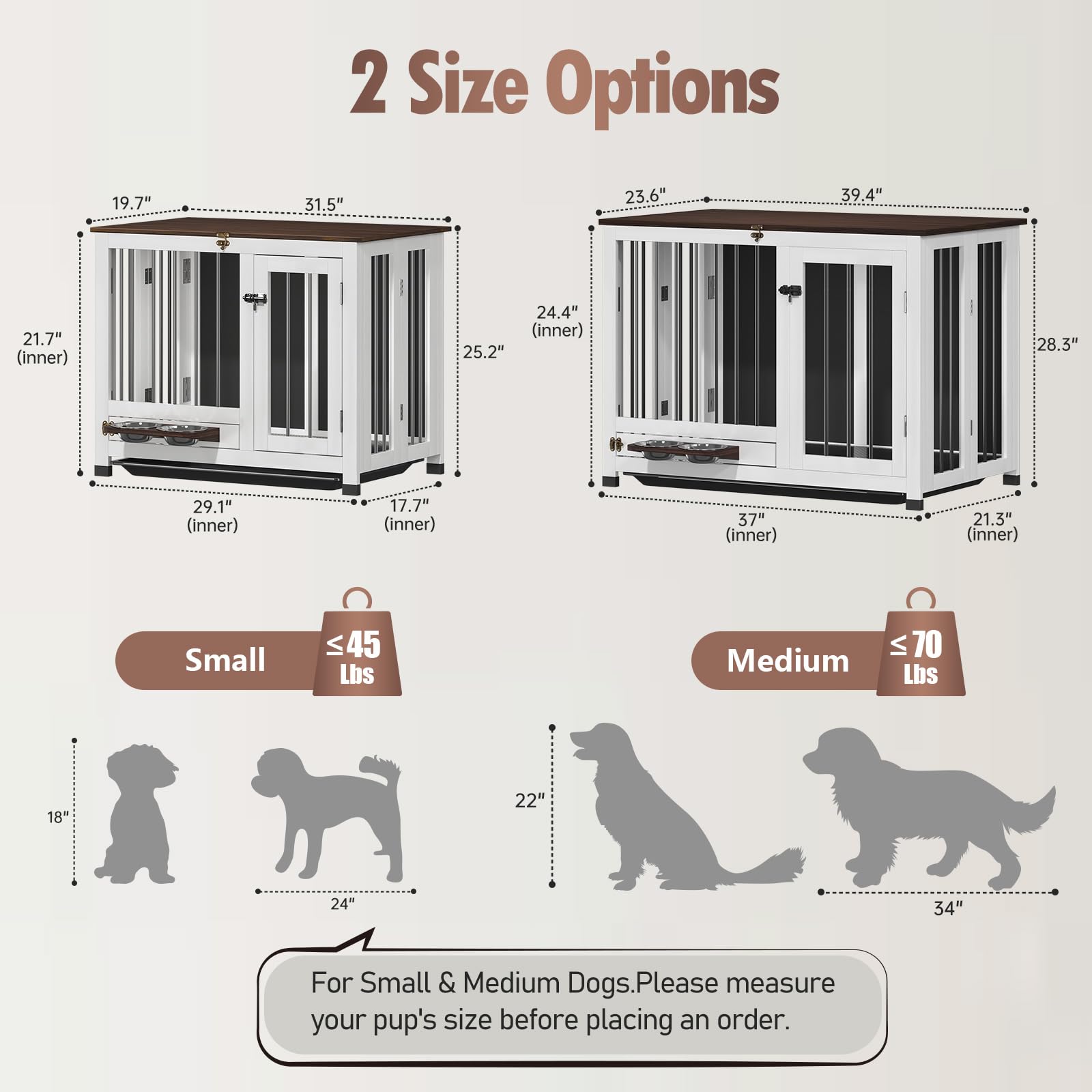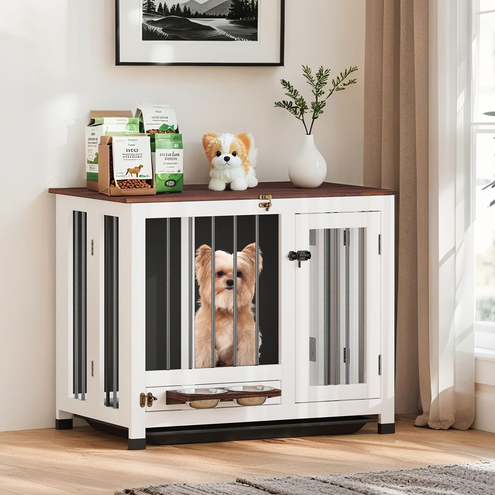 This stylish wooden dog crate doubles as a functional end table, perfect for medium and small dogs. Features a 360° rotating feeder with removable stainless steel bowl for convenient feeding without repeatedly opening the door. Built from pet-safe, kiln-dried wood with reinforced metal framing, escape-proof lock, and ventilated iron mesh flooring that prevents collar snags. The removable tray and mesh floor make cleaning effortless. Assembles in minutes with all hardware included. Blends seamlessly into any room while keeping your pet safe and comfortable.