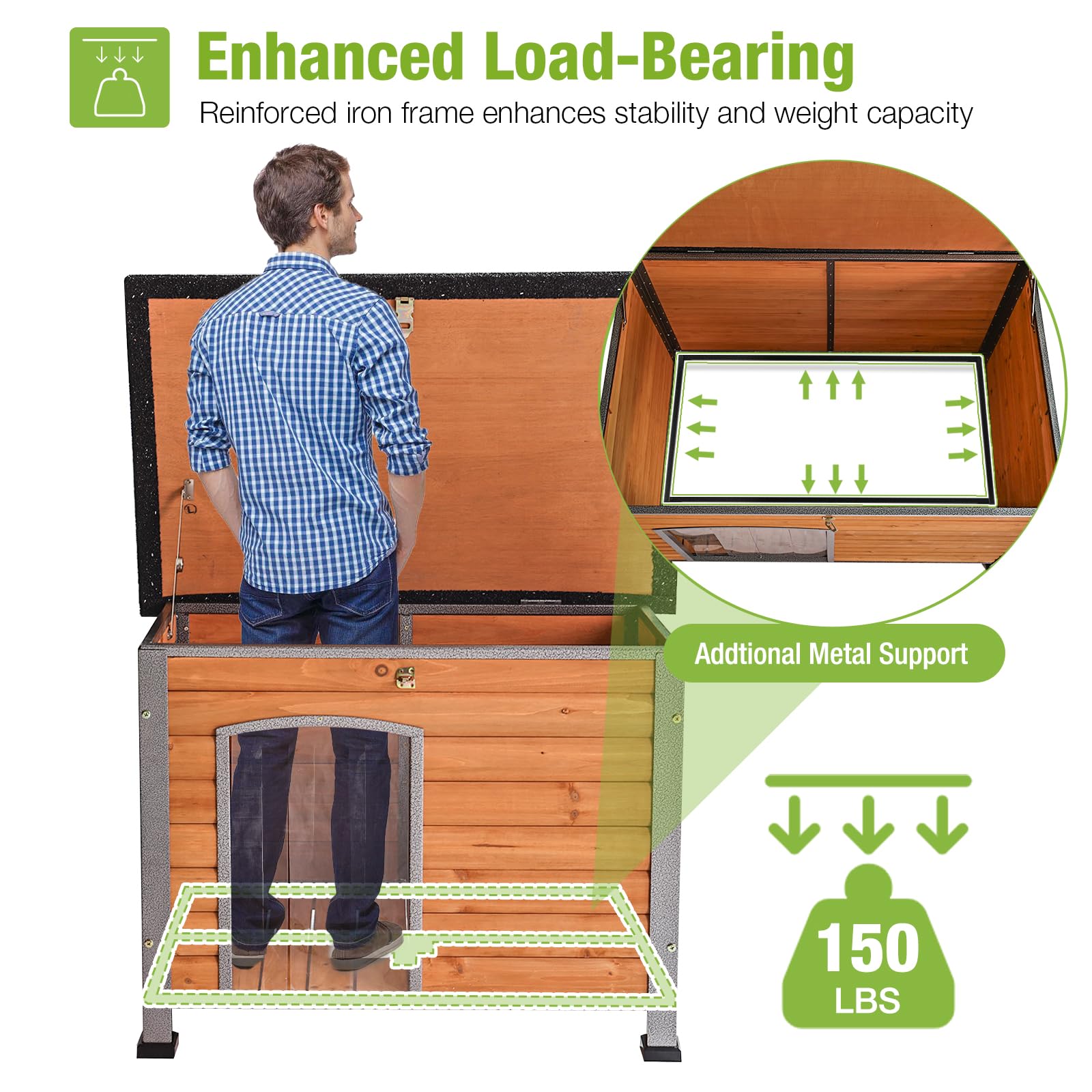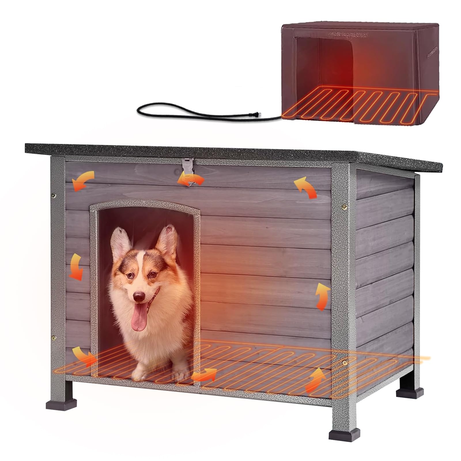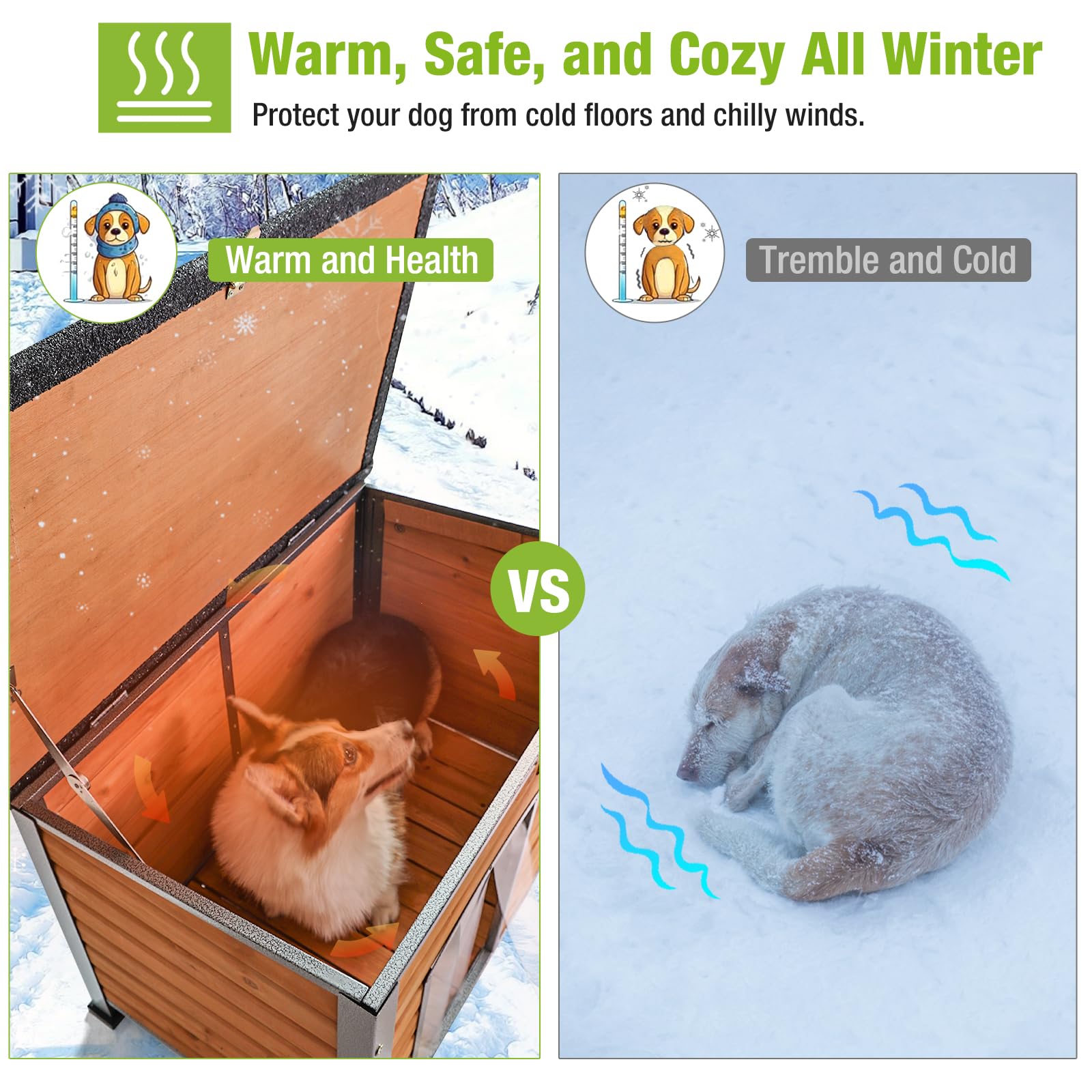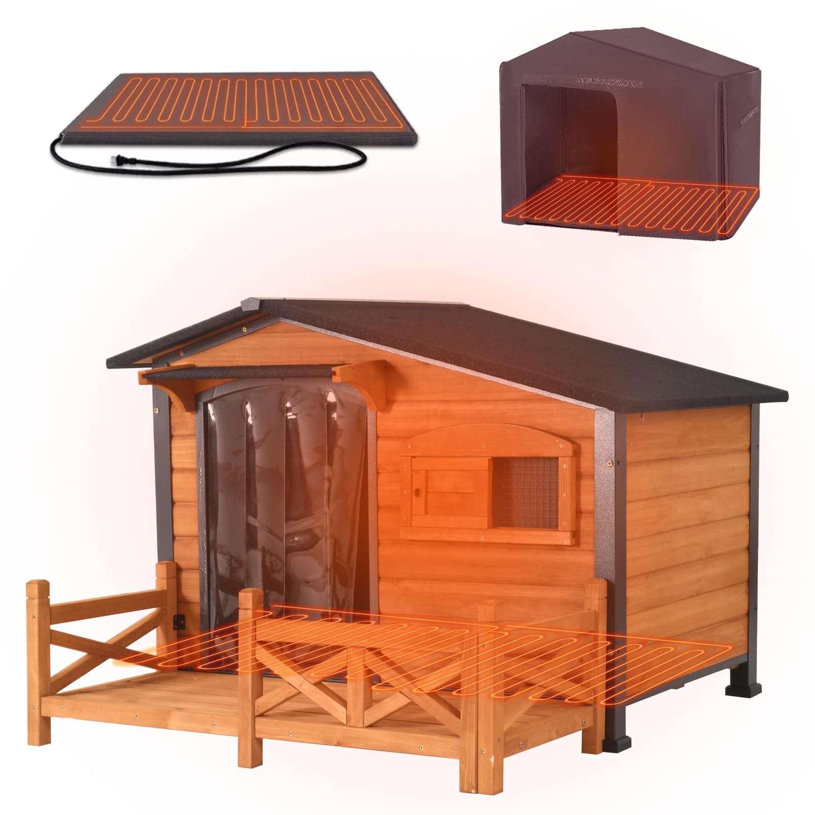 Keep your large dog warm and comfortable outdoors with this insulated dog house. Features a thermostat-controlled heating system that maintains 85–115°F with automatic temperature adjustment, plus comprehensive insulation on all sides to block cold drafts. The reinforced metal frame and solid wood construction withstand harsh weather, while chew-proof wiring ensures safety. Measuring 60.37" L x 50.36" W x 35.43" H, it comfortably fits dogs up to 180 lbs. Perfect for winter protection and year-round outdoor use.