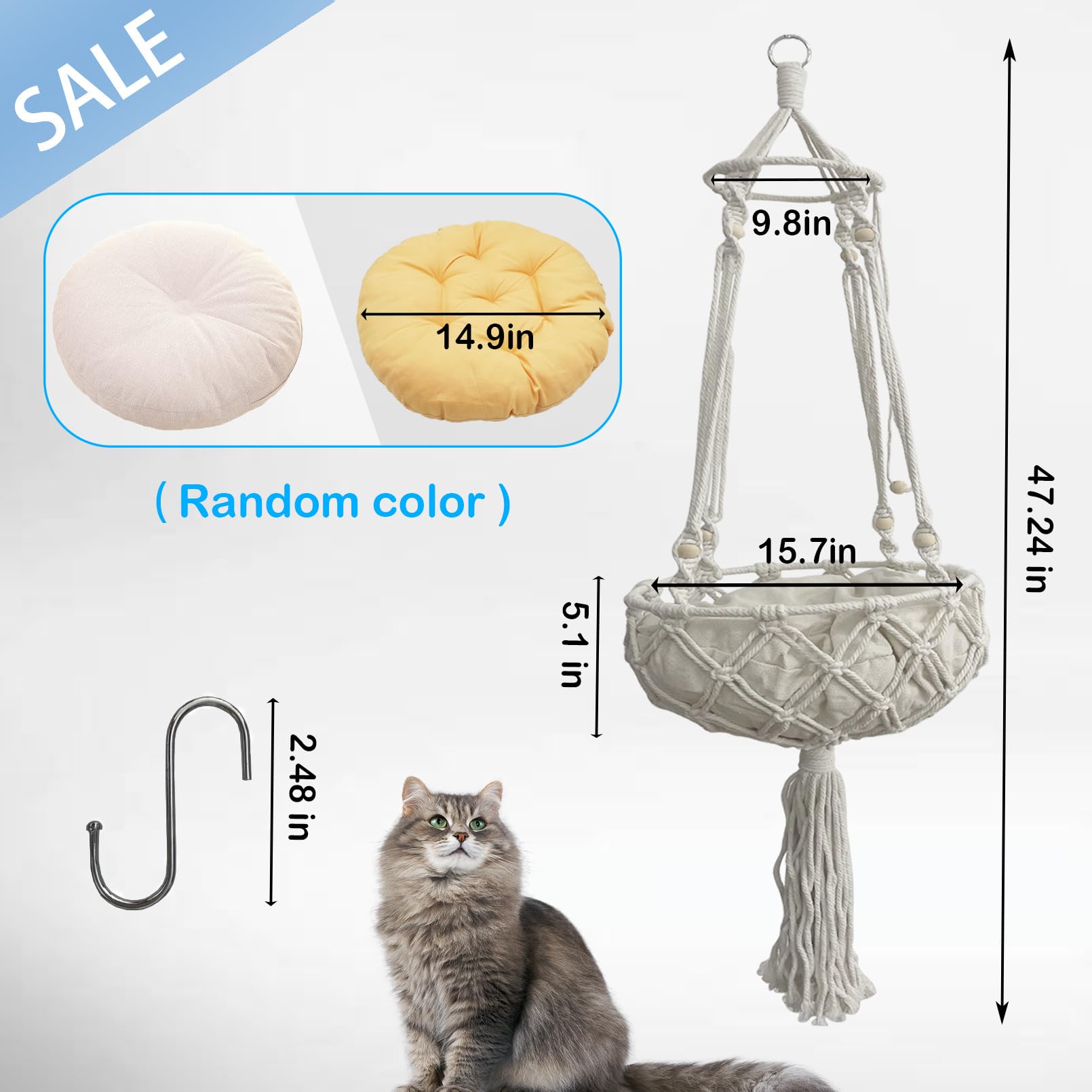Handwoven Macrame Cat Hammock Bed with Cushion for Indoor Cats