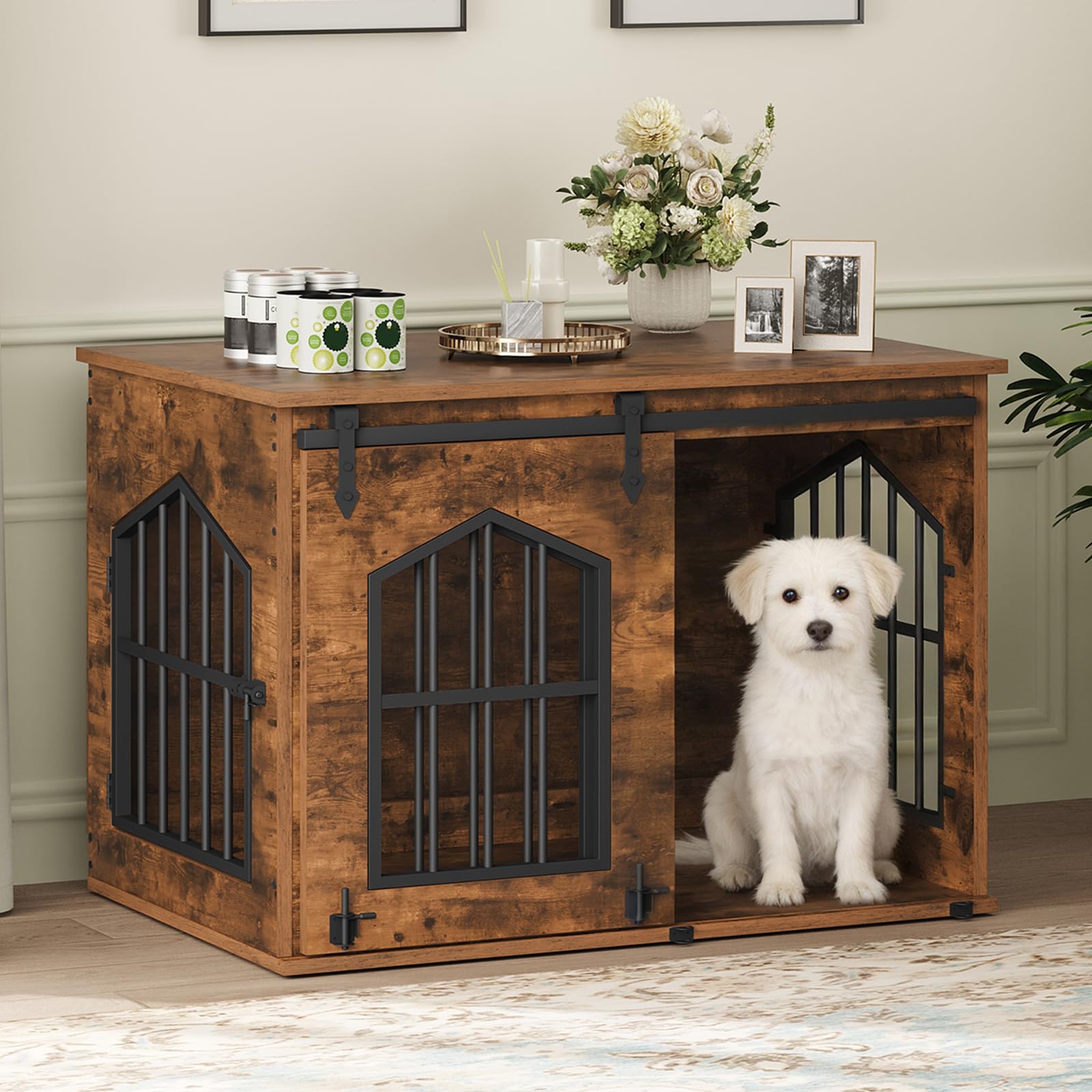 31.5" Farmhouse Wooden Dog Crate Furniture with Sliding Barn Door