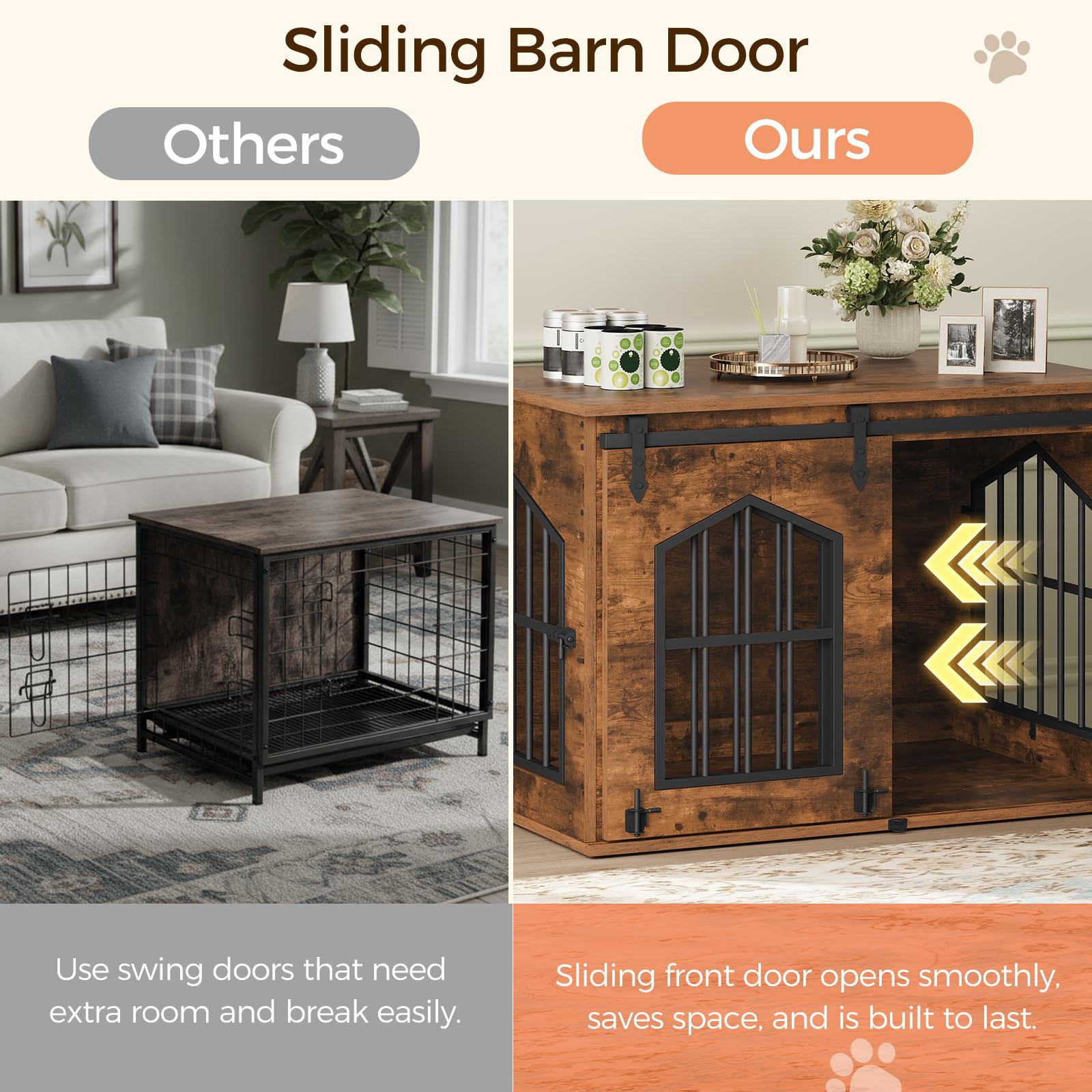 This stylish farmhouse dog crate combines comfort and function in one piece. The dual-door design with sliding barn door gives your small to medium-sized dog easy access while saving space. Use it as a cozy pet retreat or extra side table, nightstand, or TV stand. Built from particleboard and metal with a 100 lb weight capacity. Available in White+Walnut or Rustic Brown. Measures 31.5"L x 21.7"W x 24.8"H. Includes accessory kit and assembly instructions.