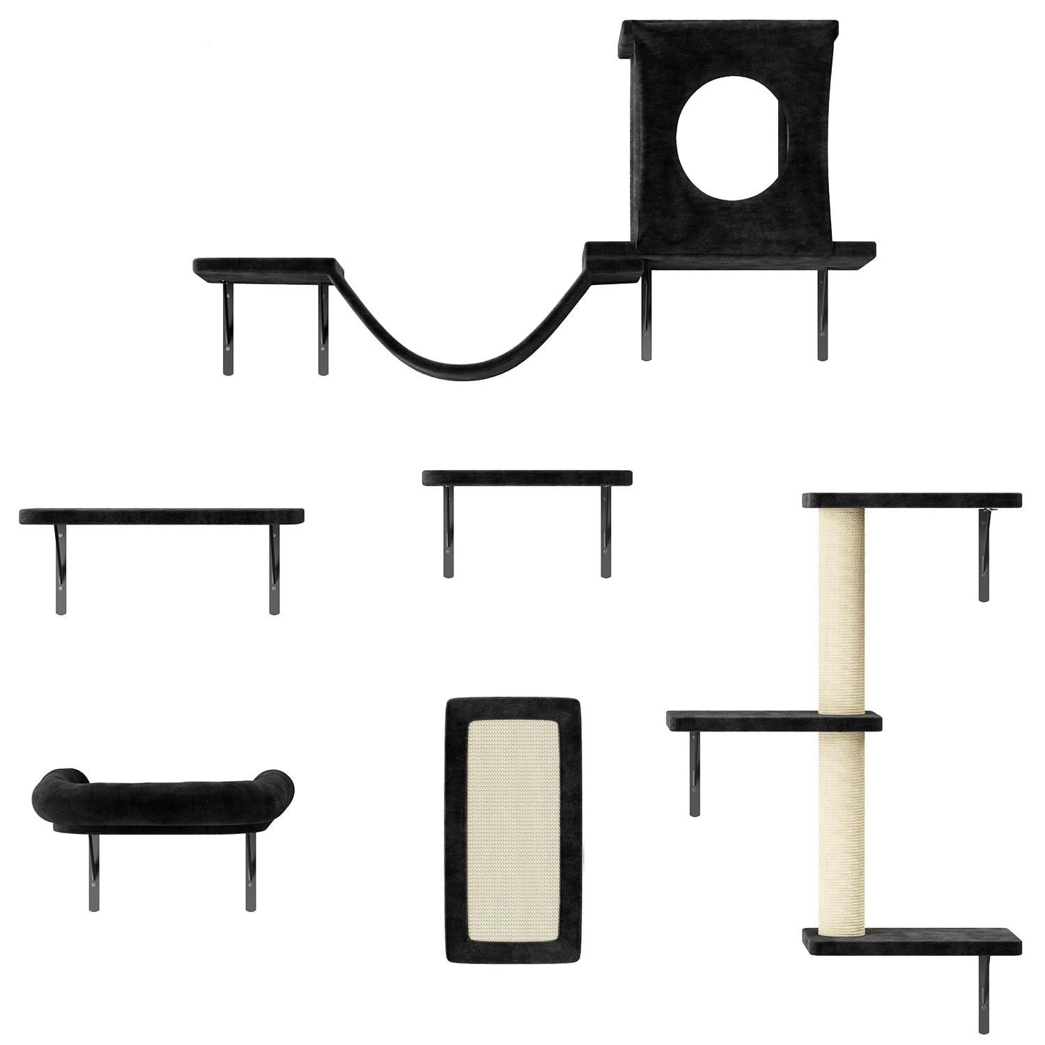 Keep your cat active and entertained with the NUNU LAB Cat Wall Shelves Set. This 6-piece modular system includes a condo, drawbridge, climbing frames, scratching board, post, and house—all designed to mount on your walls. Your cat can jump between shelves, scratch, climb, and rest in the cozy house, satisfying their natural instincts while saving floor space. Made with smooth, burr-free materials and soft plush fabric, it's safe and comfortable for cats up to 22lbs. Easy to install with an electric drill and fully customizable to fit your space and cat's jumping height. Backed by our quality guarantee.