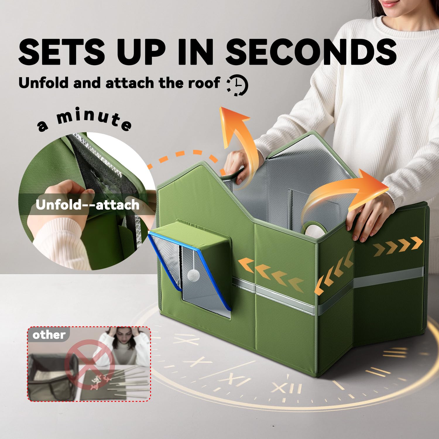 This heated outdoor cat shelter combines comfort and protection for your feline friend. The spacious interior accommodates large cats or multiple small cats, while the reinforced roof supports lounging. Fully waterproof with a raised base, windproof straps, and stakes keep it secure in any weather. Two magnetic one-way exits with predator protection let your cat escape safely. The durable PVC-aluminum frame and 600D Oxford fabric provide superior insulation while staying dry. An ETL-certified heated pad with auto shut-off ensures warmth without overheating. Setup takes under a minute with no tools required. Features include a removable, machine-washable liner, interactive toy ball, and a convenient skylight window for checking on your pet.