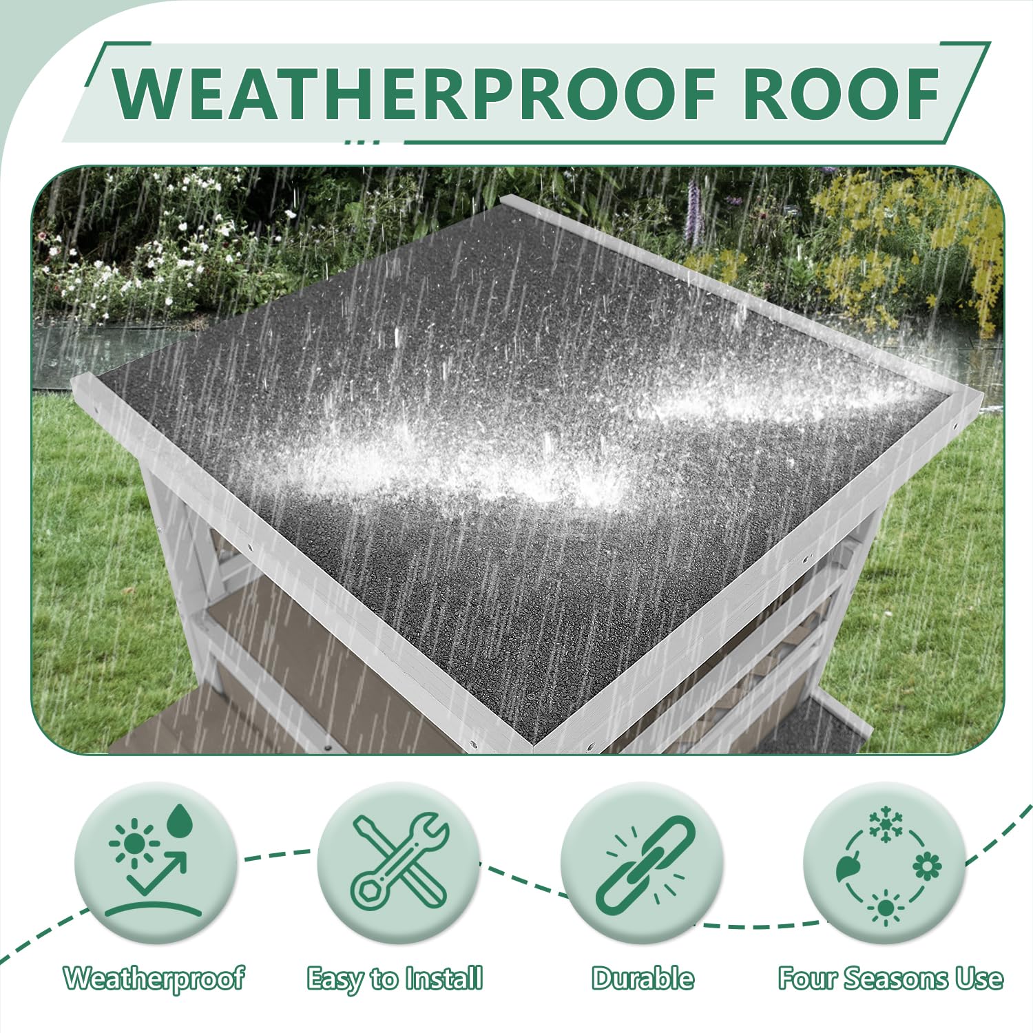 This 2-story outdoor cat house combines comfort and functionality for your feline friends. Features include three wind-blocking entryways, an openable roof for easy cleaning, and a lockable side door for convenient access. The elevated, waterproof design with slanted roof keeps cats dry year-round, while the sun deck and side platforms provide perfect spots for sunbathing, birdwatching, and exercise. The two-story layout offers cats a higher vantage point and creates an ideal playground suitable for multiple cats of different sizes. Quick assembly with pre-drilled holes makes setup effortless.