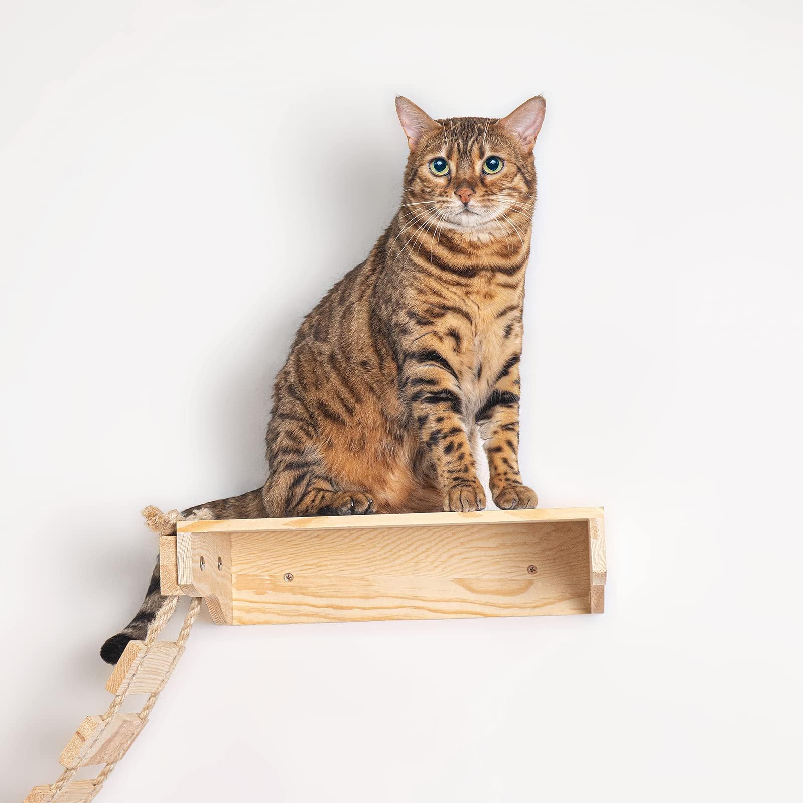 This wall-mounted cat bridge combines a slab, suspension bridge, and cozy bed in one space-saving design. Crafted from natural pine wood that's non-toxic and odorless, it keeps your cat active and entertained while protecting your floor space. The neutral wood finish complements any home décor. Includes all hardware and instructions for easy installation in bedrooms, living rooms, or any suitable wall space.