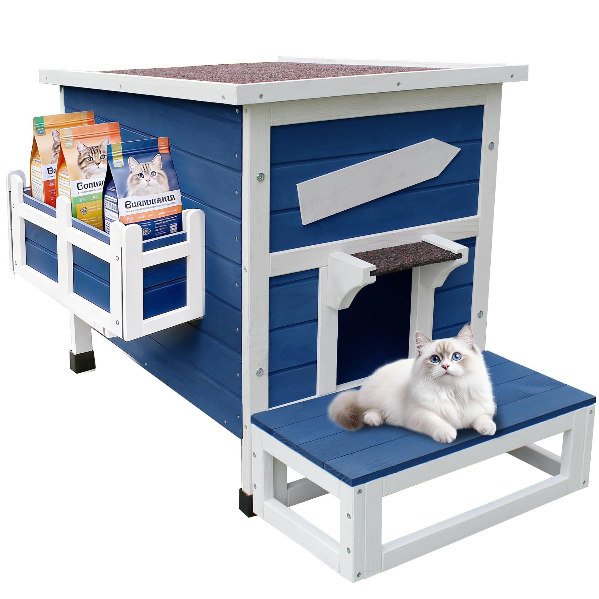 This spacious two-story outdoor cat house accommodates 3-4 cats under 15lbs with plenty of room to climb and explore. The weatherproof design features an asphalt roof, PVC door curtain, and protective feet to keep your cats dry and safe from the elements. Escape doors provide security against predators while satisfying cats' natural shelter instincts. The removable top floor and quick-release lower sections make cleaning simple—no tools needed. Pre-drilled parts assemble easily following included instructions, creating a sturdy structure that won't split or shift. Perfect for outdoor or indoor use, this shelter gives feral and outdoor cats a private, secure retreat.