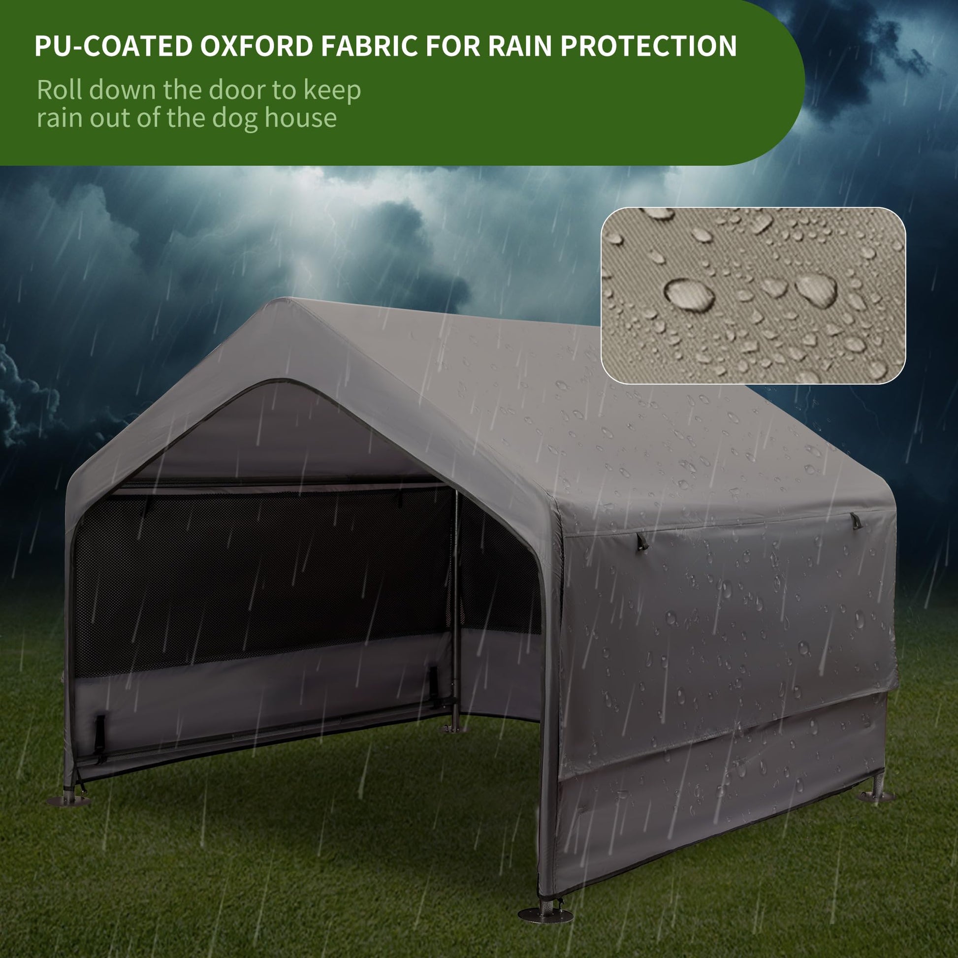 This extra-large dog house provides a comfortable outdoor retreat for medium to large breeds. The waterproof PU-coated fabric and secure stakes protect against wind and rain, while the rust-resistant steel frame ensures durability. Oxford fabric offers UV protection to keep your dog cool on sunny days. The snug-fitting canopy with hooks and elastic cords stays wrinkle-free and secure. Assembly takes just 15 minutes with no tools needed, making setup quick and hassle-free.