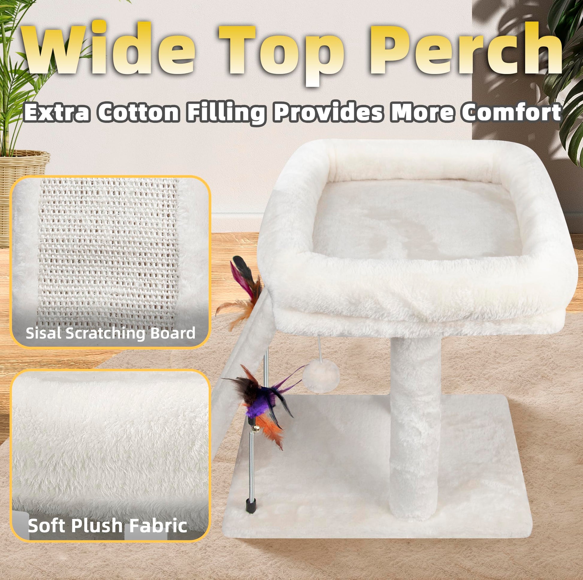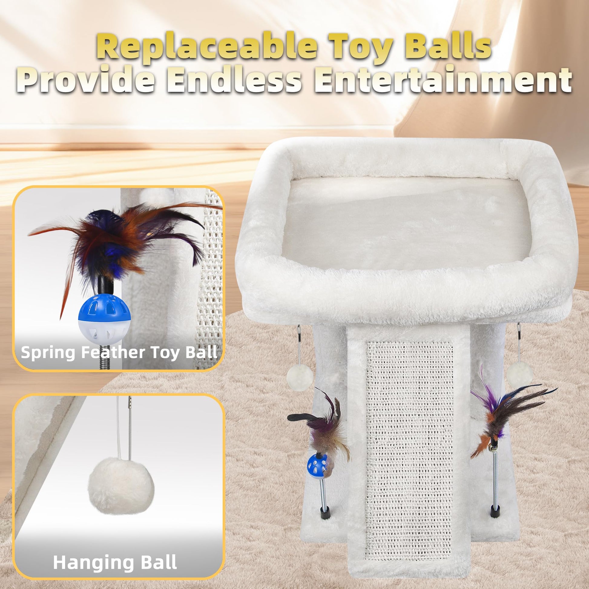 The TWDPART Fashion Cat Tree combines style with functionality in a compact 16.93"L x 13"W x 17.7"H design. Your cat gets a complete play center featuring multiple levels for climbing, a plush top platform for napping, interactive hanging and spring balls for entertainment, and a natural sisal scratching post to protect your furniture. Built with durable, high-quality materials that support cats of all sizes, this tree assembles quickly and moves easily from room to room. Give your feline friend the perfect spot to play, scratch, and relax.